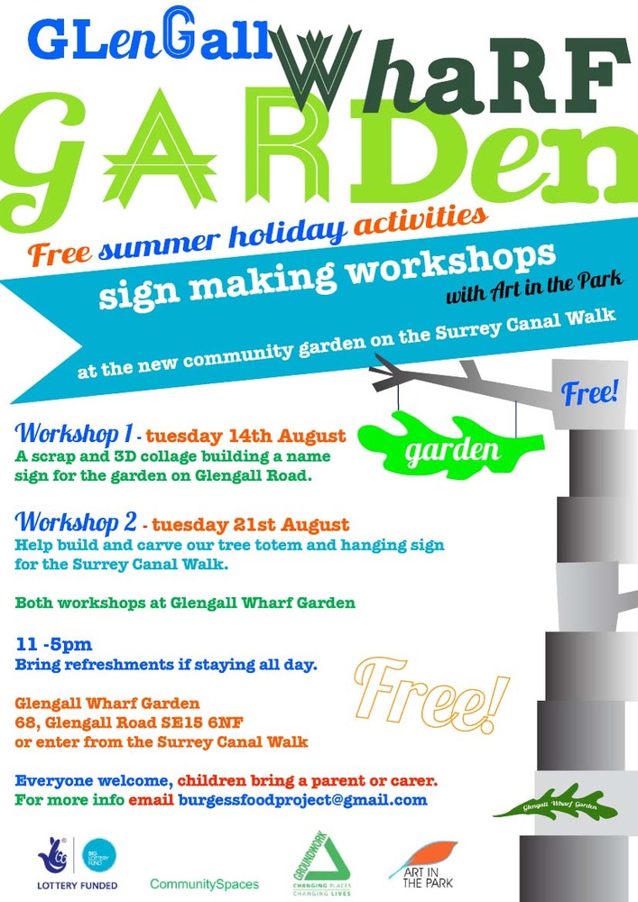 Bring the kids along to help us make our signs with Art in the Park. All ages welcome to help build letters out of scrap and then help carve our tree totem. The workshops will take place at the garden on Glengall Rd / Surrey Canal walk.